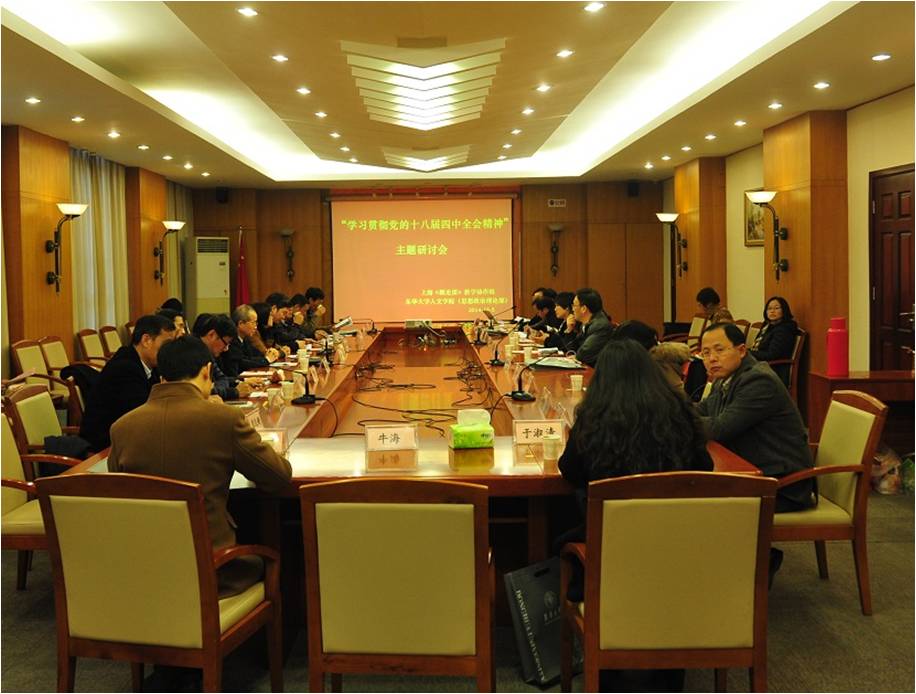 会上,上海师范大学汪青松教授,华东理工大学徐国民教授,我校章礼强教授和秦德君教授分别作了专题发言, 武汉大学社会科学研究院院长沈壮海教授作了点评交流和主旨演讲。与会专家学者围绕“党的领导与依法治国的关系”“依法治国与国家治理体系、治理能力现代化的关系”“依法治国与全面深化改革的关系”“全面推进依法治国的重大意义”“党的十八届四中全会与概论课教学的结合”等议题展开深入研讨。