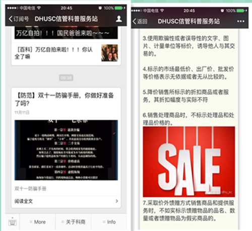 活动中,学院科学商店的同学们结合保卫处提供的每月校园案情信息,制作了防诈骗知识专题展板,摆放在教学楼走廊等醒目位置。一张张图文并茂的展板,一个个鲜活的案例,吸引了不少同学驻足观看。“这些展板内容丰富、案例详实,为我们进行网络购物提了醒,有较强的警示作用”,金融1404班的李昱同学说。结合当下流行的“双十一”购物潮,活动还通过管理学院科学商店微信平台发布关于防诈骗的推送信息,推送内容涉及一些不诚信商家惯用的手段以及应对措施,提醒同学们谨慎购物,避免不必要的经济损失。