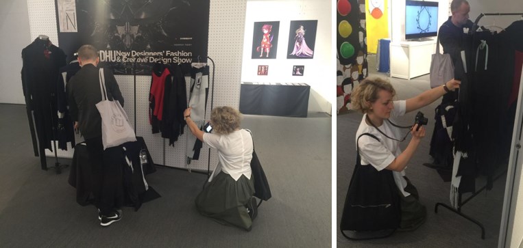据卢政介绍,其马海毛设计作品《犯罪现场调查》系列,通过对“犯罪嫌疑人”这个假想概念,探索信息安全这个社会问题。在服装款式设计上,露出的拉链头,吊牌上的信息,不规矩的纽扣,衣服的里布等代表嫌疑人证据来自在犯罪现场发现的一些细节和线索;面料上,设计师通过把原先线圈织的毛衣拆解重新通过梭织的方式组合在一起;色彩上,趋于保守,用的是比较低调的黑色、蓝色、白色、豆沙绿色。