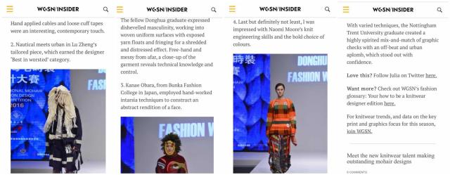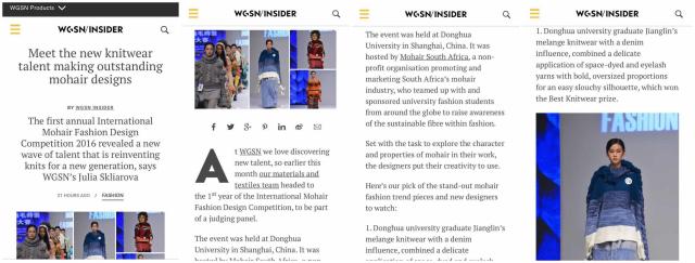 近日,著名时尚预测与流行发布专业机构WGSN(全称Worth Global Style Network)在其官网发表题为《新锐设计师惊艳的马海毛针织设计》(Meet the new knitwear talent making outstanding mohair designs)的报道,从创意服装设计专业角度分析了我校服装学院新锐设计师团队作品,文章认为,无论是服装创意设计、材料选择、颜色搭配,还是款式造型创新方面,都已经达到国际水准。