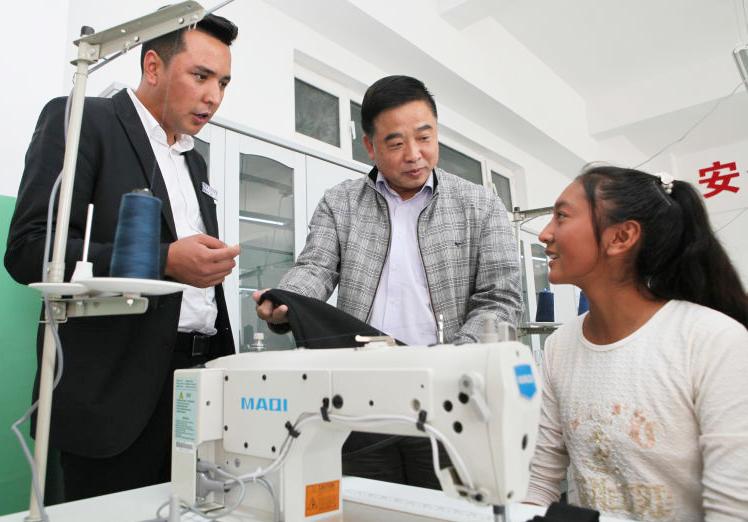 (喀什职业中等学校首届纺织服装专业学生在进行基础缝纫实训。左二为上海援疆前方指挥部人才民生组组长、喀什地区教育局副局长陶文捷)