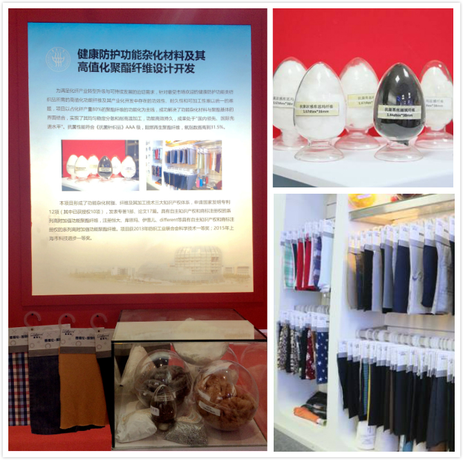 (“健康防护功能杂化材料及其高值化聚酯纤维设计开发”项目展台及资料图)