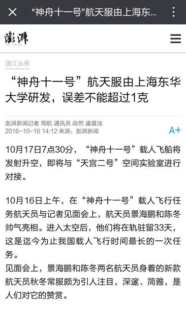 [上海发布]“东华设计”助力打造“神舟十一号”航天员新形象 (上海市政府新闻办公室官方微博)(2016年10月16日)