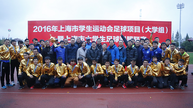 11月22日,2016年上海市学生运动会足球项目(大学组)暨上海市大学生足球联盟联赛在复旦大学落下帷幕,我校校园组足球队对阵华东政法大学,以2比0的比分战胜对手,卫冕男子甲组冠军,实现三连冠。队长李勇学当选最佳运动员,主教练徐强强荣膺最佳教练。校党委副书记、纪委书记金海燕到场观战,并为亚军球队华东政法大学队颁奖。