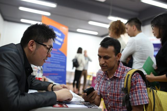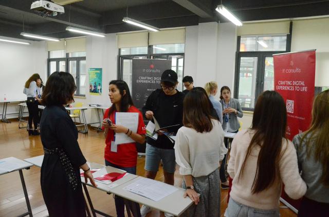 4月25日,学校举办首届外国留学生招聘会,海航集团、中国恒天、朗高投资等近50家公司来校现场设摊,提供相关实习和就业共计150多个岗位,行业涵盖航空、机械、时尚设计、国际贸易、信息技术、语言翻译等。约400名本、硕、博留学生参加应聘,这也是上海高校首次举办的规模较大的外国留学生招聘会。