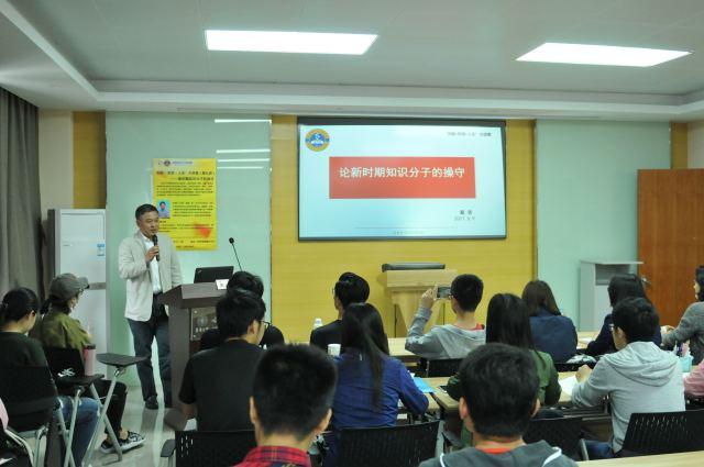 戴蓉老师对“知识分子”一词的发展和定义进行了理论阐述,以《岳阳楼记》中“先天下之忧而忧,后天下之乐而乐”的历史名句为引子,结合明朝末期东林党顾宪成的一副对联的下句“家事、国事、天下事、事事关心”背后的历史故事,讲解了中国知识分子具有强烈责任感和关注社会国家发展的特点及操守。同时,戴老师介绍了新中国成立后历任领导人对于知识分子的重视,并总结了新时期知识分子应有的操守,即:以中华民族伟大复兴的中国梦为己任、倡导符合社会发展的道德观念和社会风气以及传播科学知识的同时传播正能量。