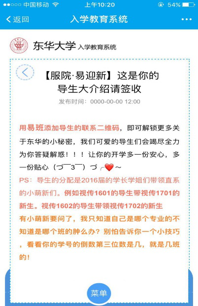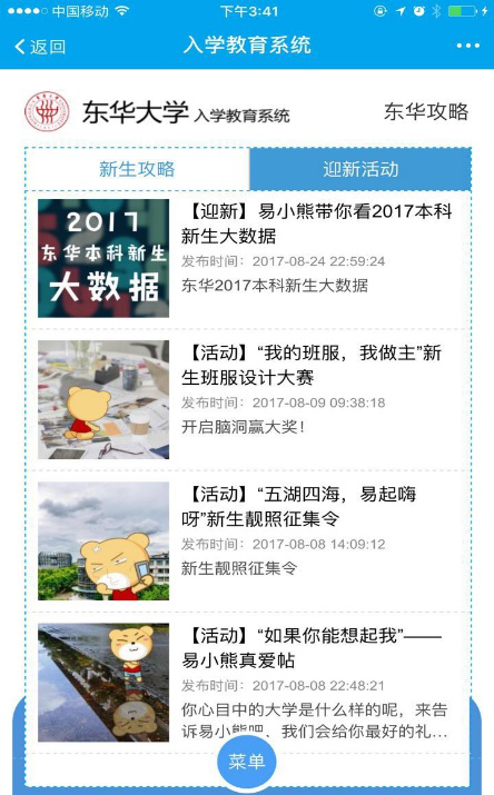 “易”路同行,一路真情相伴。暑假期间,我校58名专兼职新生辅导员全部进驻易班为新生答疑解惑,东华易班机构号为新生们量身定做了10个迎新“大礼包”精品帖,报到流程、各学院入学教育日程表、家长会查询、校园一卡通使用视频等一应俱全,发布至今,累计浏览量10万多人次。