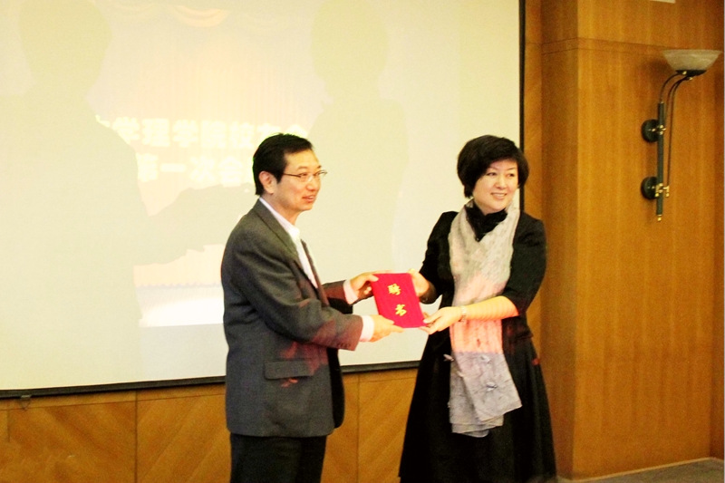 (刘春红副校长向邱高副校长颁发首任理学院校友会会长聘书)