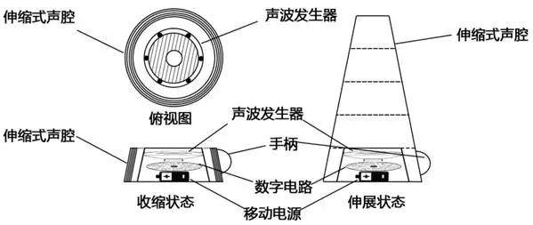 官老师告诉记者,这款声波灭火器的工作原理在于通过声波产生振动,改变火焰所在区域的空气压力和温度,进而降低可燃物周围的氧气浓度、空气压力和反应物温度,通过循环的机械运动持续抑制火焰燃烧,打破燃烧链式反应,最终实现灭火。灭火器主要由基于3D打印技术的伸缩式声腔、声波发生器和功率放大器三部分组成,采用锂电池供电,清洁无污染,不会在灭火时和灭火后造成任何环境污染和破坏,对人体也没有影响,和以干粉、泡沫、二氧化碳等为介质的传统灭火器相比其优势十分明显。