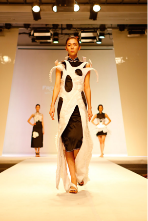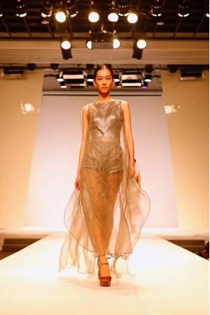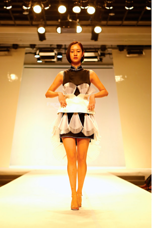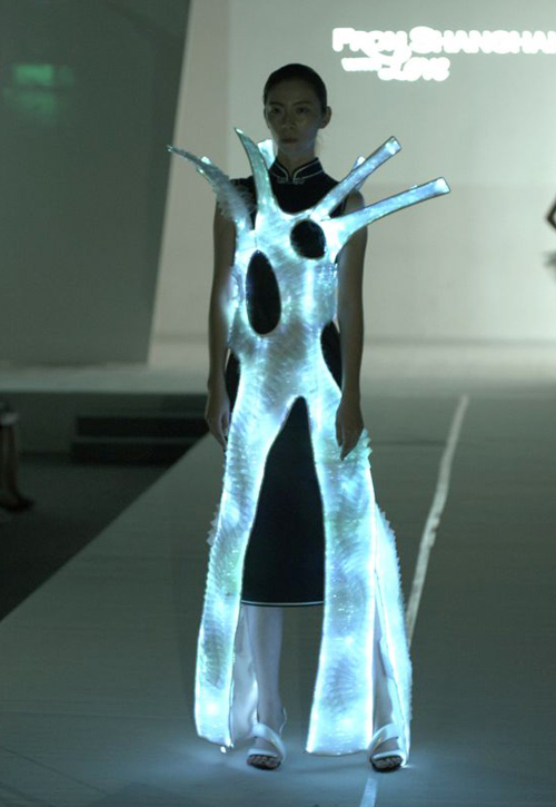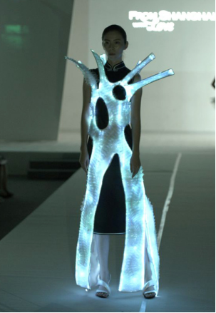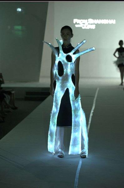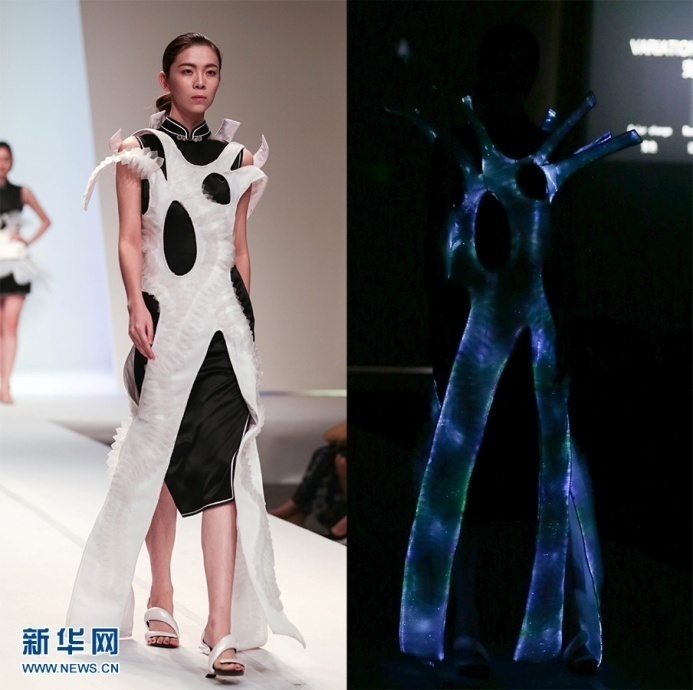 变奏上海——变形旗袍系列设计灵感来源于上海生态自然与建筑的关系,以解构主义服装造型设计手法,结合记忆金属丝的通电复原造型的特性,在传统旗袍的基础造型上集成变形、变色的科技元素,创造出奇幻的服装造型变化的效果。