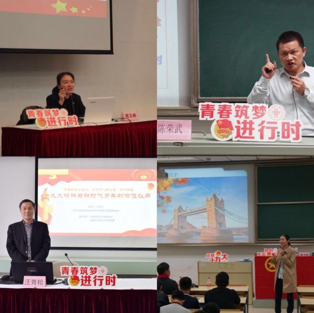 此外,我校还积极组织师生开展十九大精神巡讲,“学习宣传贯彻党的十九大精神——千名高校优秀辅导员校园巡讲”和“网络巡礼”活动(上海)巡讲团成员、我校专职党务干部王乔松,辅导员黄铭心、魏金婷、彭湘陵,党的十九大精神上海团学骨干宣讲团成员、我校团学骨干李华清、徐少东等开展校内巡讲活动。