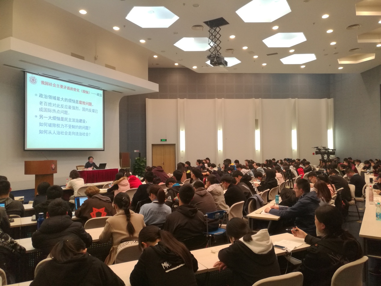 讲座中,他还结合自己在解放日报发表的社论文章,通过案例引导同学们该如何正确看待中国成长之“烦恼”。主要从政治、经济、文化、社会、生态五个方面,重点阐释了经济不平衡、文化精神匮乏、诚信危机、环境污染等问题。并以十八大以来我国改革开放所采取的各项措施,分析了我国政治文明所取得的历史成就。在随后的互动环节,部分同学就如何加强个人理论素养、如何提高自我表达能力等与黄老师作互动交流。