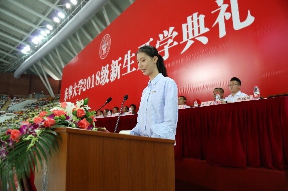 服装与艺术设计学院的伍钰晖同学代表新生在典礼上发言。“士不可以不弘毅,任重而道远。我的逐梦之旅将在东华启程,逐梦的路上会有众多挑战,我们也要不畏山高、不畏路远,与时偕行,勇担时代责任和历史使命。”伍钰晖同学代表所有2018级新生说出了心声。她还说,将始终牢记东华人的使命与担当,秉承“崇德博学、砺志尚实”校训精神,脚踏实地,锐意创新,为实现中华民族伟大复兴的中国梦贡献自己的青春力量。