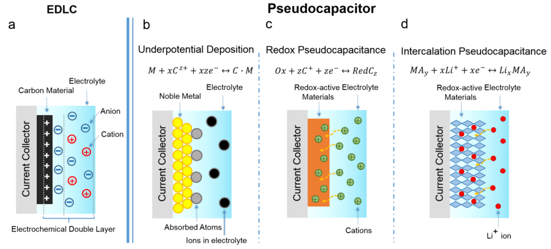 图3.双电层电容及三种不同赝电容机制的结构示意图