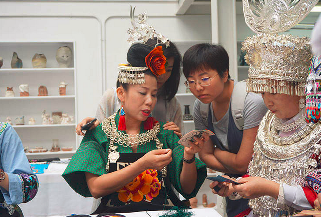 “我爱上刺绣了!”来自黔东南民族职业技术学院的苗族姑娘潘凤英在校专业就是工艺品设计,天天和刺绣、银饰、蜡染打交道,可是从小就看着妈妈给自己绣嫁妆的潘凤英之前并不喜欢刺绣,因为太耗时、太枯燥了,潘凤英之所以对刺绣的态度有这样180度大转变,要归功于非遗研修多门课程的耳濡目染。因为会画画,潘凤英说要把苗族瑰丽的历史故事画下来、绣出来,自己创业。