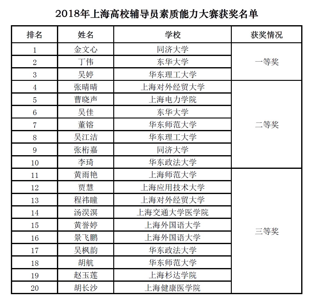 上海51所高校的100名辅导员同场竞赛,开展素质能力大比拼。比赛中,选手们紧扣主题要求,结合辅导员工作实际进行了精彩的展示。他们旁征博引、思想丰富、逻辑严谨、仪态大方、充满正能量,充分展示了上海高校辅导员队伍良好的素质能力和精神面貌。经过激烈角逐,最终产生一等奖3名、二等奖7名、三等奖10名。我校管理学院辅导员丁伟、材料学院辅导员吴佳凭借扎实的理论基础、深厚的职业素养和良好的素质能力,以从容、自信、沉稳的现场表现从众多选手中脱颖而出,分别荣获一等奖和二等奖。