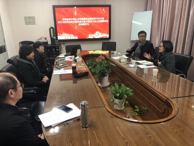 1月17日,人文学院党委理论学习中心组在松江校区召开会议,专题学习习近平总书记在庆祝改革开放40周年大会上的重要讲话精神。党委副书记刘淑慧出席会议。人文学院党委书记王英主持会议,学院党政班子成员廖大伟、罗薇娜、吴志刚出席会议。与会人员分别阐述了自己在学习习近平总书记在庆祝改革开放40周年大会上的讲话精神的学习体会。