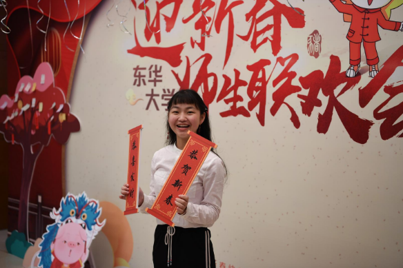 火红的灯笼,缤纷的气球,换上“新春装”的校训,手拿糖葫芦、红鞭炮的东小阳……联欢会的现场红红火火,温情满满。“猪年Happy!心如所愿!心如所想!”、“阖家平安健康,论文多多,实验顺利,早日毕业”,一株别具心意的许愿树上,贴满了同学们写下的新年心愿。一旁的许愿墙前,人头攒动,大家忙着挑选 “六级550分”、“获得奖学金”、“恭贺新春”、“未来可期”等接地气的心愿牌,争相留念。