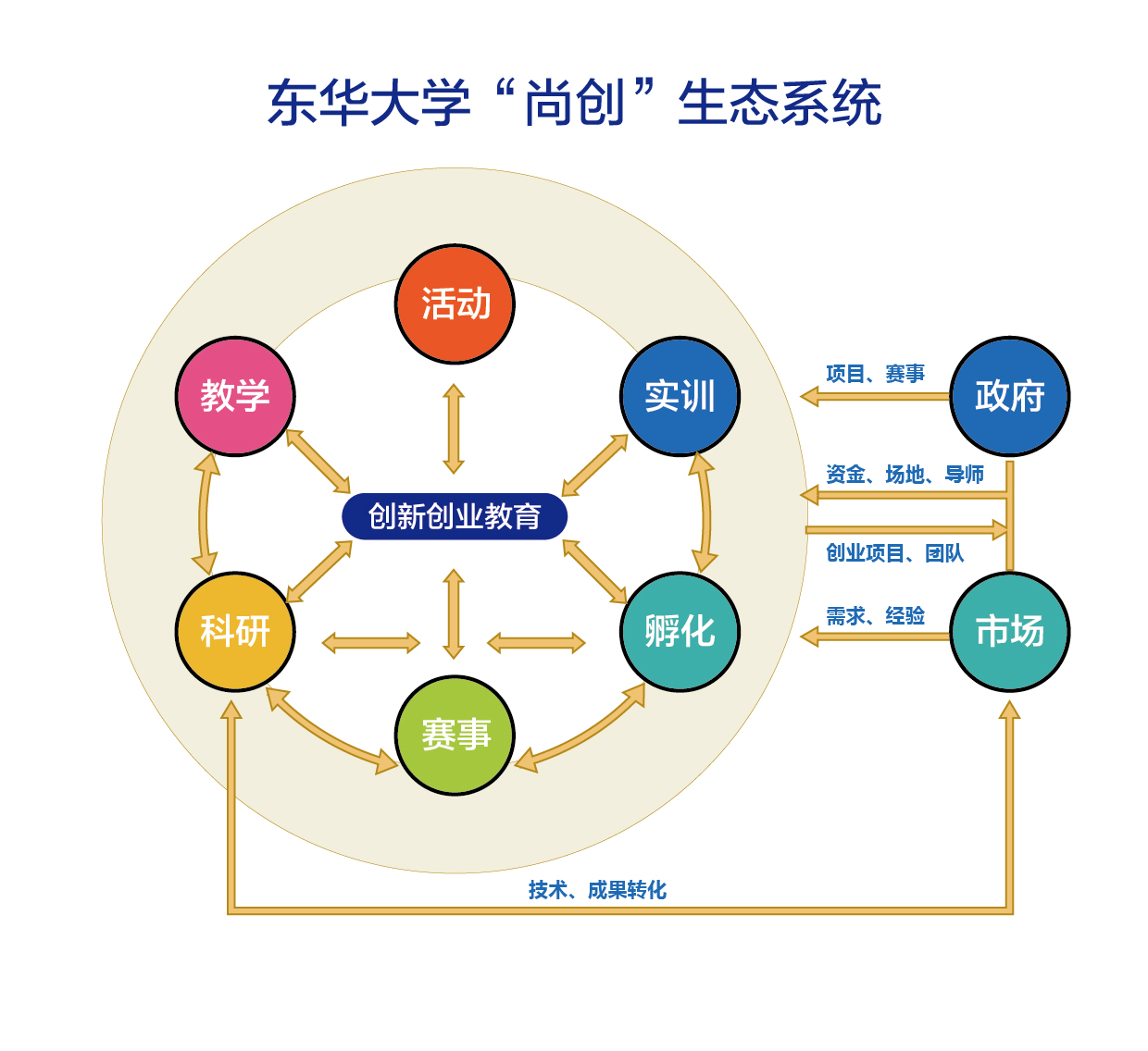 说到生态系统,让人很容易联想到生物课上的食物链。而我校近年来着力打造的“尚创”生态系统,将带给人们一个关于创新创业人才培养的生态系统新概念。从课内到课外,从实验室到大赛事,从校内到校外,“尚创”生态系统依托教学、科研、活动、赛事、实训、孵化等六位一体的融合模式,形成了学校、政府、市场多方协同的创新创业人才培养闭合环,可谓新时代践行“三全育人”理念的创新之举。