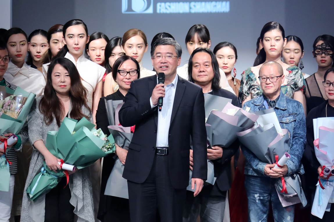 (朱民、李永智为现场设计师颁发“2019上海时尚之都建设服装设计成就奖”)