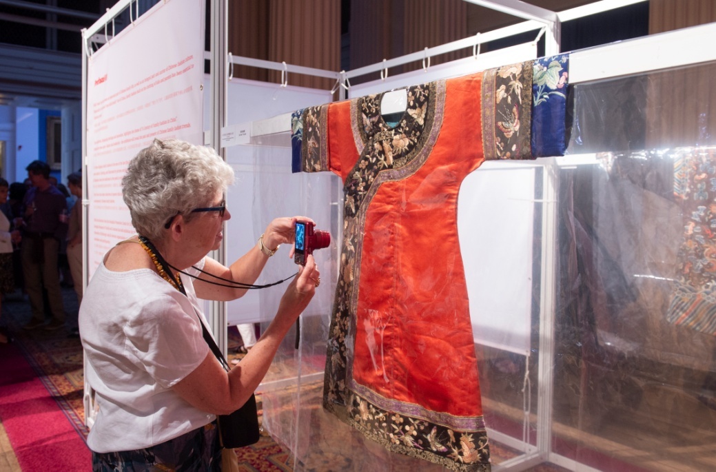 与秀演同期亮相的还有上海纺织服饰博物馆带来的“儿童与父母——百年中国家庭服饰风尚展”,呈现了百年中国家庭服饰风尚的历史与现状。展览分为历史和现代两大部分,历史部分主要展现晚清民国家庭的服饰风尚,以童装为主,再现从传统到中西交融的时尚流变。现代部分为中国著名设计师及艺术家陈闻先生设计的亲子装,和使用中国古典绘画中的青绿山水元素,将环保可持续新技术与传统文化、时尚艺术完美结合的无水印染科技旗袍系列,体现当代中国家庭的时尚衣着。