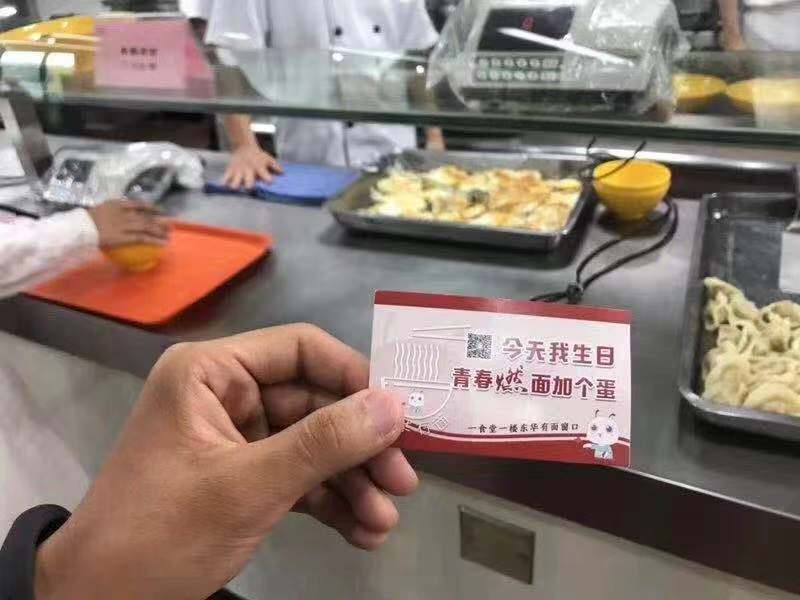 国庆期间,学校还推出了“国庆面”主题活动,在延安路校区第一食堂、松江校区第一食堂选择任意面条,赠蛋一个,在东华食府用餐,送西红柿鸡蛋手工面一碗,以“感恩分享”为主题,与师生共同欢度国庆。据统计,两校区供应“国庆面”约2000份,送出煎蛋约2000只。