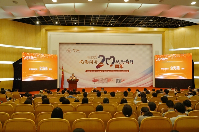 10月19日,我校人文学院“风雨同舟,砥砺前行”20周年院庆大会在松江校区举行。党委副书记金海燕出席大会并讲话。学校相关部处负责人,人文学院退休的老领导和老同志、校友代表以及学院师生参加活动,为学院庆生。