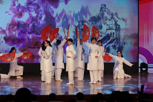 汇演在合唱《我爱你 中国》中拉开帷幕,悠扬婉转的歌声,瞬间激发了观众的热情,点燃了全场的气氛。《铭记》《祖国赞》《今天是你的生日我的中国》《不忘初心》等节目,表达了对祖国深情的爱恋和美好的祝愿,表演感人肺腑,催人奋进。《飞天梦》《疯狂星期六》《春风十里(东华版)》《相信自己》,演绎了东华人自信的面貌和昂扬的斗志,激励广大教职工牢记教育初心,坚守立德树人使命。《太极扇》《寄明月》《绒花》典雅与动感交融,诗情与画意并存,展示了中国传统文化的博大精深和深厚底蕴。退休教职工带来的《我和我的祖国共美好》《爱我中华》,展现了海派旗袍的时尚魅力和中华民族一家亲,让观众领略了改革开放后祖国发生的巨大变化,展现了现如今老有所乐的幸福生活。我校乐天相声社走出来的校友、东方卫视第四季《笑傲江湖》全国总冠军获得者霍星辰,还带来了相声《劳动号子》,用幽默的语言艺术,赢得了观众的阵阵掌声。