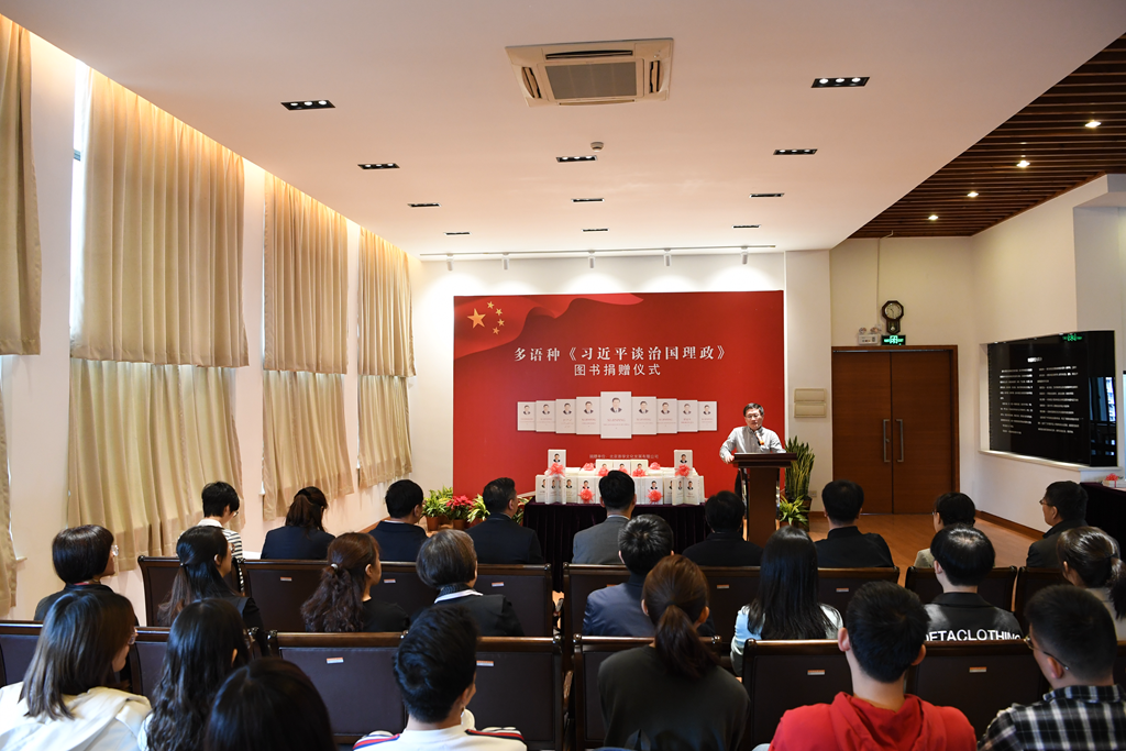 11月6日上午,多语种《习近平谈治国理政》图书捐赠仪式在延安路校区图书馆举行。党委书记刘承功出席捐赠仪式并致辞。副校长邱高代表学校接受捐赠,并向捐赠单位颁发证书。相关学院及职能部处负责人和师生代表参加活动,捐赠仪式由图书馆馆长方建安主持。