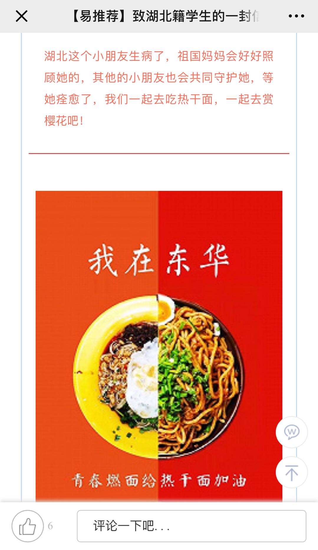 学校易班平台推出《东华故事》之“2020,明天会更好”,积极进行疫情防护知识教育,发布“了解新型冠状病毒”“新型冠状病毒感染的肺炎防护小知识”以及“不计报酬,无论生死”等专题帖,提醒全校师生调整心态、正确防护,用心用行共抗疫情。发布《致湖北籍学生的一封信》,让学生在居家期间,感受到学校的关心和温暖。组织开展“守护你我 爱满天下”抗击疫情网络作品征集活动,累计收到100余份原创作品。在《战“疫”里不倒的中国力量》音频课上,来自管理学院的5位辅导员老师与学生一起感知中国力量,理解大爱仁心,勇担时代使命,努力成为一名传播爱、奉献爱和充满爱的新时代中国青年。