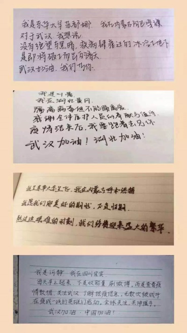 “你不要怕,我也不怕。我们深信黑暗终将消散,光明即将到来;爱和希望比疫情蔓延的更快。”“寒不敌温暖、毒不侵正义。中国加油,武汉加油!”“隔离的是病毒,凝聚的是人心。加油,武汉!我们与你们在一起!”疫情期间,各学院纷纷组织团支部开展“云”主题团日活动,同学们以抗疫祝福、手绘手写、拍摄vlog短视频等形式传递对武汉、对湖北、对中国的祝福和支持,一句句温情的话语、一幅幅原创设计作品、一个个加油视频背后是东华学子们一颗颗滚烫的心,与武汉同胞心在一起,齐心协力,共克时艰,为打赢疫情防控阻击战积极贡献青春力量。