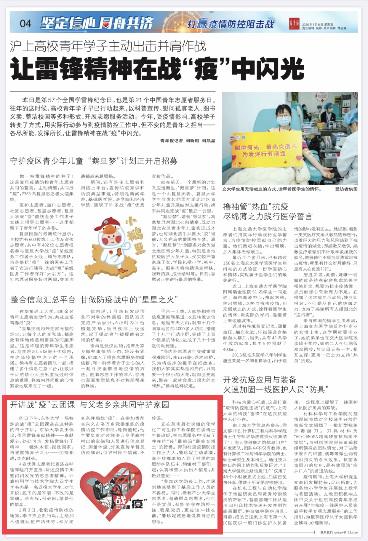 编者按:2020年3月6日,《青年报》第4版《沪上高校青年学子主动出击并肩作战 让雷锋精神在战“疫”中闪光》报道了在雷锋日我校一场特殊的战“疫”云团课的开展情况。部分文章转载如下: