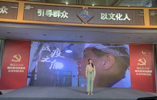 在活动现场,我校“学习进行时”学生理论宣讲团围绕十九届五中全会精神和新时代新思想带来了精彩宣讲,回顾了近年来东华人在航空航天、服装设计、对口扶贫、基层服务等领域卓越贡献的足迹,并展示了东华人在口罩研发和大规模生产中彰显的东华力量和责任担当,将十九届五中全会中的社会主义现代化远景目标蓝图徐徐展开,用学生视角讲述东华故事,用青年之声阐释全会精神。上海工程技术大学理论宣讲团、上海外国语大学宣讲团队也带来了“幸福松江,老有所养”“茸城故事,云间华章”的宣讲展示。