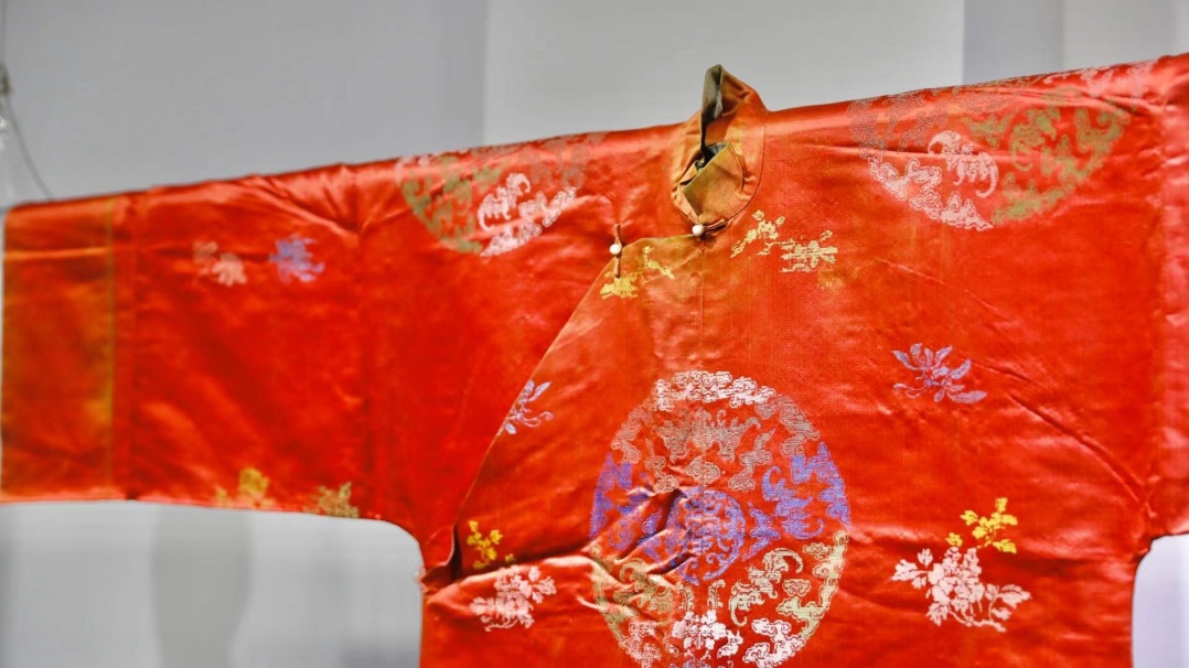 而此次展出的云锦精品大红妆花缎五福捧寿团纹大襟女袍,为19世纪后期制作,宽身直袖、立领大襟、圆下摆,两侧开衩。衣身面料为大红缎地,其上纹样用妆花手法织出,胸前、后背和两肩处有四个五福捧寿团纹,下摆处有立水江崖,上织五彩花鸟、蝴蝶纹,精美绝伦。