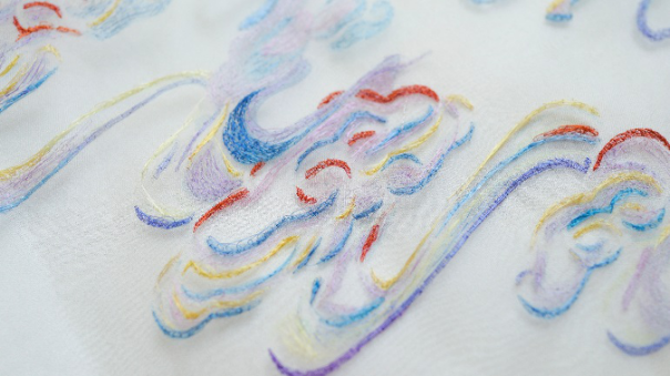 同样引人入胜的展品,还有苏绣服装“玲珑五色”,裙身图案来源于国画中的经典祥云纹样。它以苏绣戗针勾勒祥云轮廓,以滚针充实祥云形体,以套针绣出渐变色彩,以直乱针和斜乱针表现云雾的浓淡和光影。底部印制的同色祥云图案,更是增强了纹样层次感。