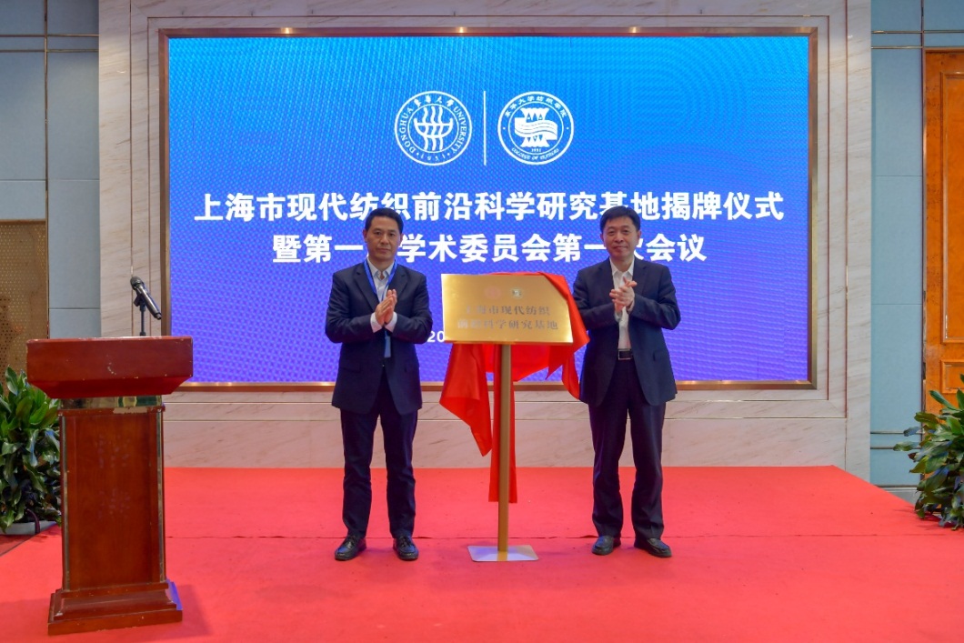 (校长、中国工程院院士俞建勇和纺织学院院长顾伯洪为基地揭牌)