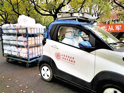 上海交通大学电子信息与电气工程学院杨明教授研发的智能车在校园里为大家送餐。学校供图