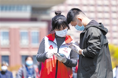 4月4日,上海建桥学院开展全员核酸检测,学校170名雷锋志愿者和55名退伍军人主动为大家服务。施楠 摄