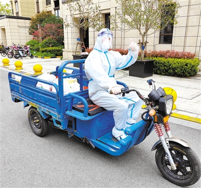 上海市嘉定区百合花幼儿园倪晓敏老师骑三轮车为社区运送物资。李程剑 摄