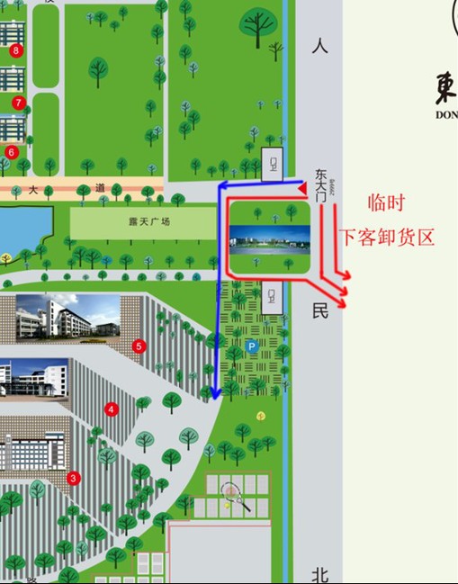 (红线为送新生未审批车辆入校线路;蓝线为校内职工和已审批车辆入校线路)