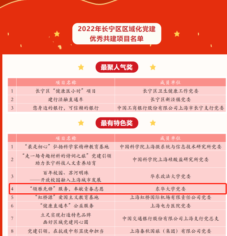 近日,2022年长宁区区域化党建优秀共建项目最终结果评选出炉。经过前期展示和线上评比,旭日工商管理学院党委“‘领雁先锋’服务,奉献青春志愿”项目从41个候选项目中脱颖而出,荣获“最有特色奖”。