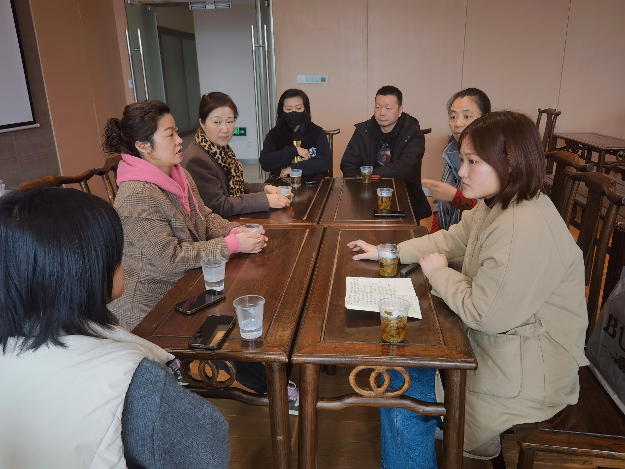 上海露香园顾绣研究院的黄翼飞院长和费菲一起带领回访小组参观了展厅,展厅中的顾绣作品精美秀丽,黄院长介绍,他们制作作品的方式,是由多个绣娘完成一幅作品,每个部分都由最擅长这种刺绣的绣娘完成,以臻完美。参观之后黄院长、费菲与回访小组进行座谈,黄院长讲述了自己在非遗商业化方面的经验,回访小组的老师、上海非遗保护中心钱主任就非遗的商业化路径做出了不同层面的解读与探讨。老师们对于顾绣的多样化呈现,如与服装和文创的结合等提出了建议,黄院长表示受到了很大启发。